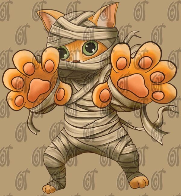 Este design hilariante apresenta um gatinho laranja coberto por ligaduras de múmia, a exibir as suas grandes patas para um abraço (ou ataque!).