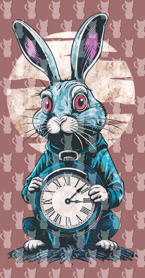 Design Único: Destaca-se o coelho azul-escuro sobre o fundo claro de uma lua (ou relógio) gasta, com o detalhe do pêlo e do casaco a dar textura.