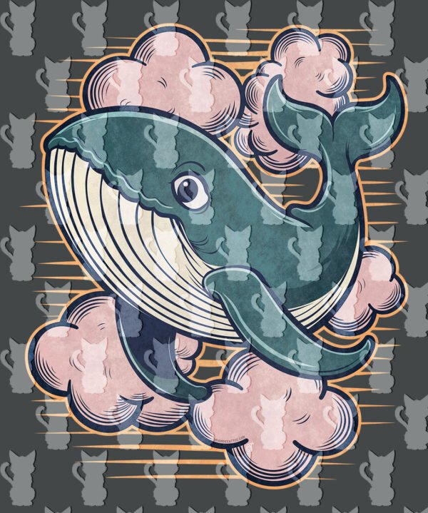 Este design combina a majestade da baleia (azul-petróleo) com nuvens cor-de-rosa e linhas laranja de pôr do sol, num estilo cartoon divertido.