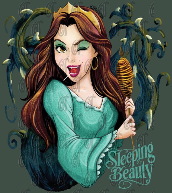 Sleeping Beauty | Twisted Tales | Princess Aurora | Bold Drawing | Aqua Green | Spinning Wheel | Thorns | Irreverent Humor | Satire | Strong Contrast | Fantasy | Bold Design | Rebel Princess | Cartoon | Winking Eye