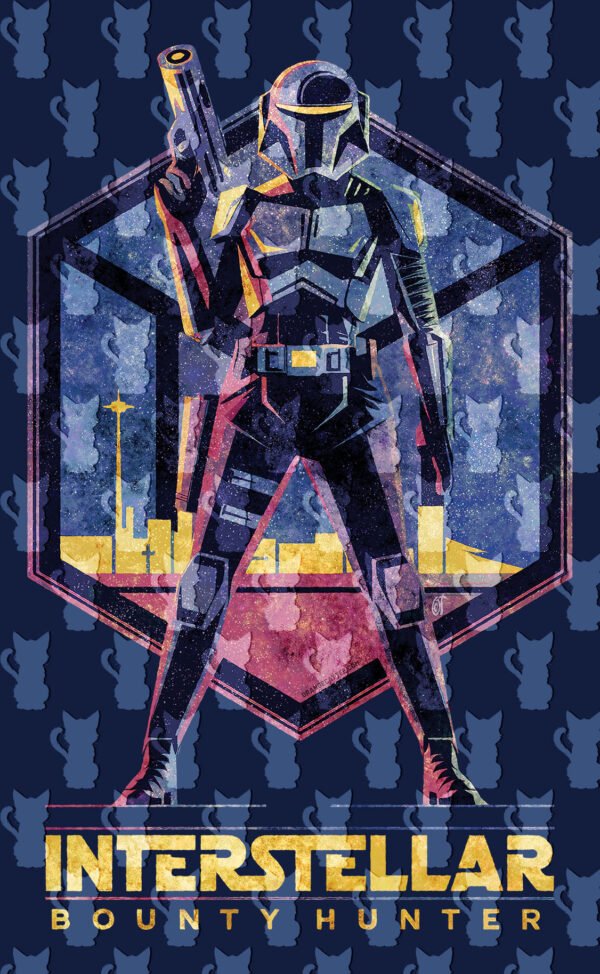 Este design épico apresenta uma figura blindada e imponente, com uma pistola, emoldurada por um hexágono cósmico.