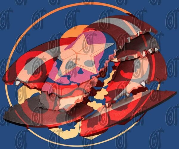 Este design intenso apresenta o escudo quebrado e distorcido de um herói, revelando o crânio da Hidra e cores de conflito.