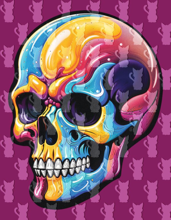 Este design apresenta uma caveira (crânio) com o corpo pintado em cores néon que parecem derreter-se — amarelo, rosa, azul e roxo.