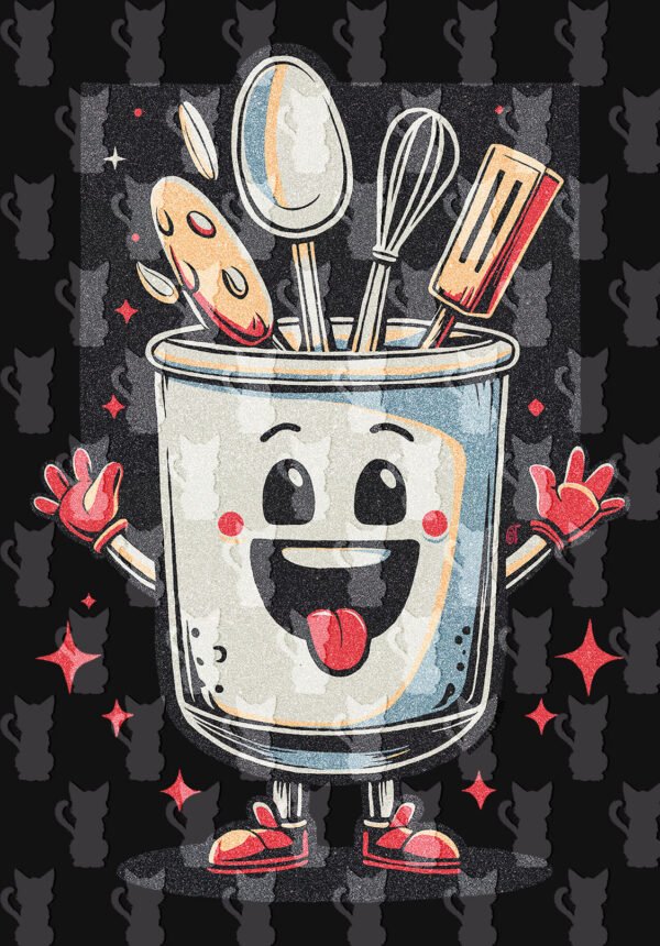 Este design super divertido apresenta um pote (ou copo) de cozinha animado e sorridente, repleto de utensílios essenciais.