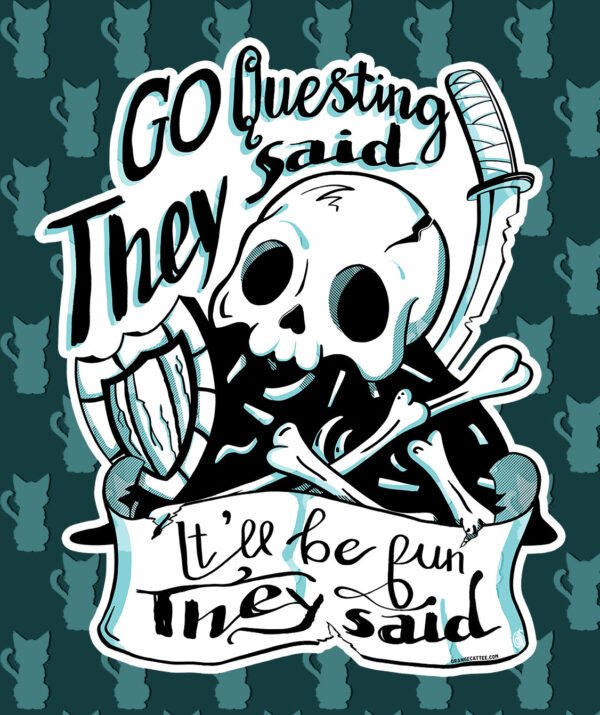 Este design irónico e geek apresenta uma caveira e ossos (os restos do aventureiro) com a frase “GO Questing, said They. It’ll be fun, They said”.