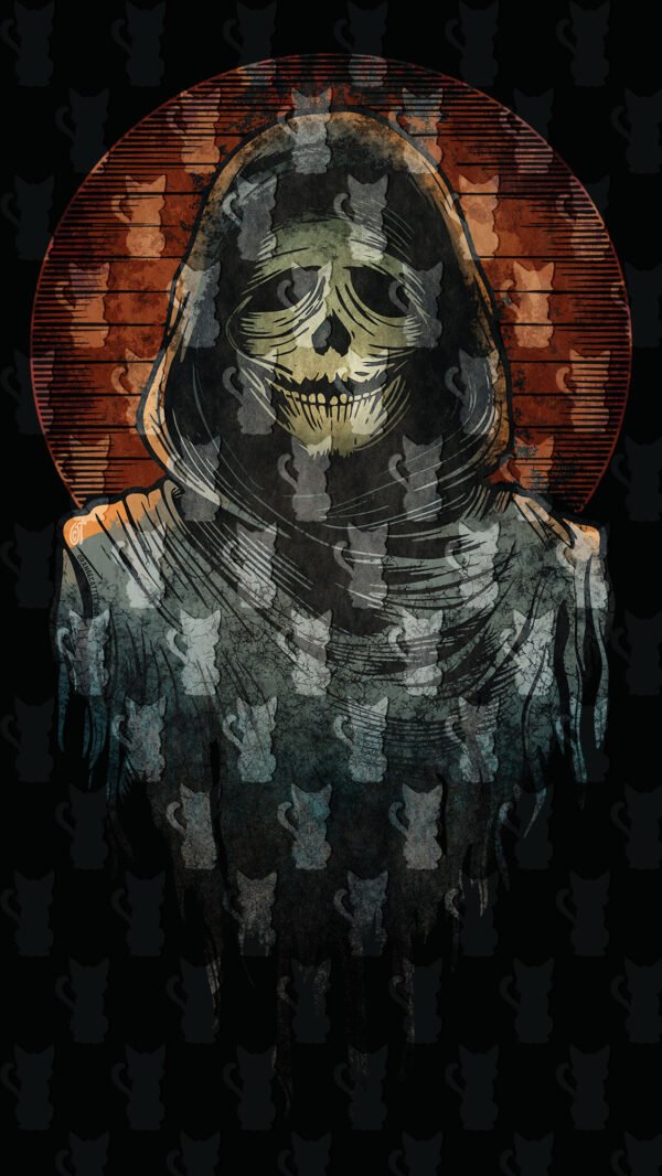 Este design macabro apresenta um Ghoul ou um espectro encapuzado, com um sorriso esquelético e ameaçador, a emergir da escuridão.