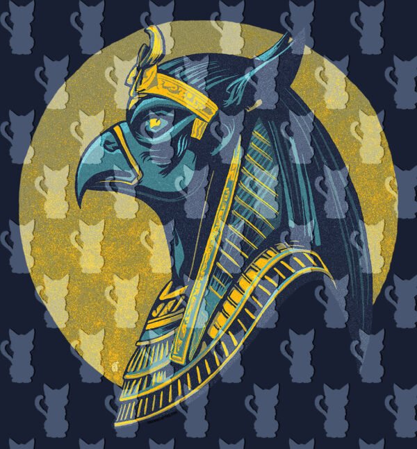 Este design apresenta Hórus, o deus com cabeça de falcão, adornado com a coroa e a joalharia tradicional.