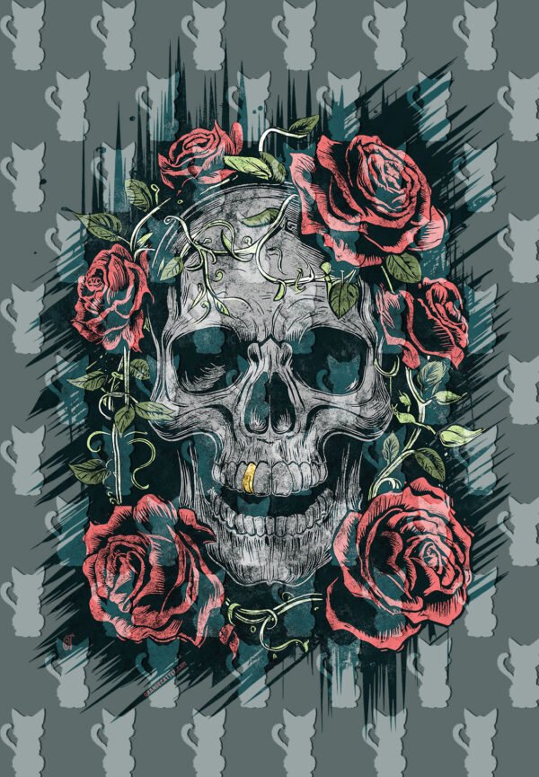 Este design sombrio e romântico apresenta um crânio (caveira) adornado com rosas vermelhas e videiras, num fundo grunge escuro.