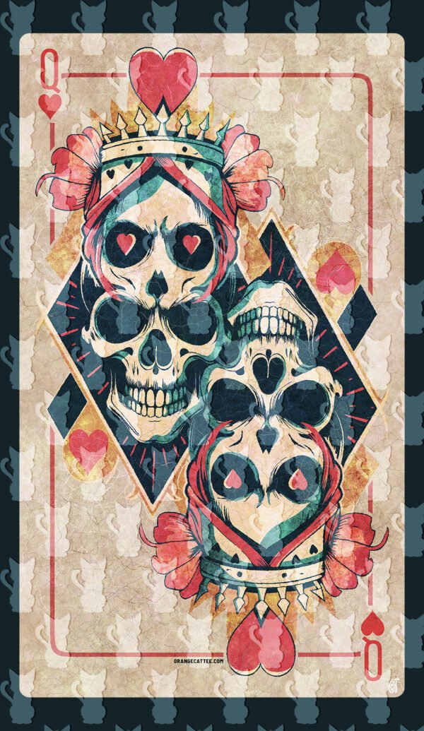 Este design apresenta a Rainha de Copas (Queen of Hearts) com caveiras adornadas com corações e flores, num estilo de carta de baralho vintage.