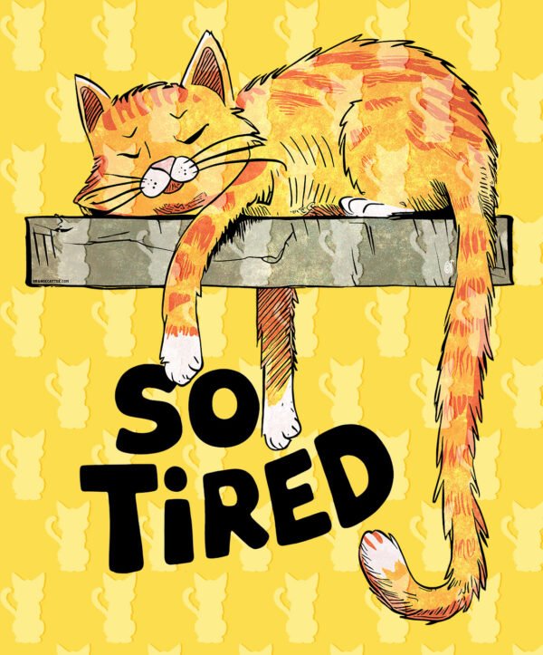 Este design hilariante apresenta um gato laranja exausto, pendurado numa prancha de madeira, com a frase “SO TIRED” (Tão Cansado) em tipografia arrojada.