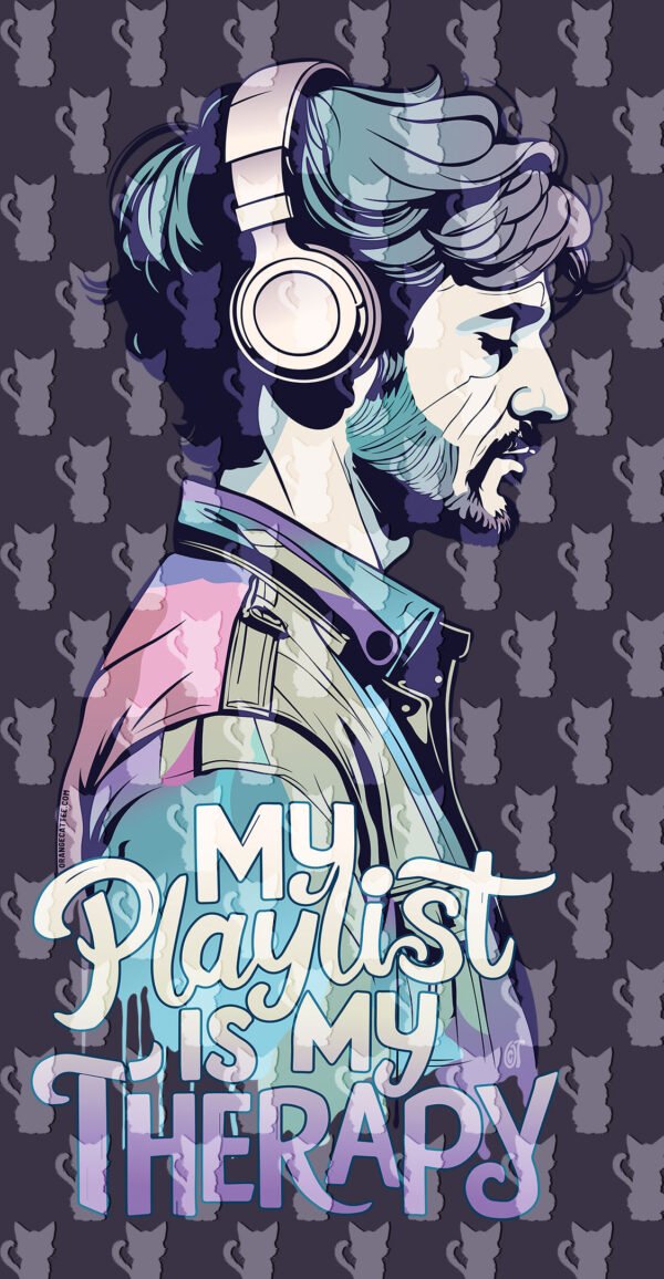 Este design apresenta uma figura masculina de perfil, a ouvir música com auscultadores, com a frase “MY PLAYLIST IS MY THERAPY” em lettering arrojado.