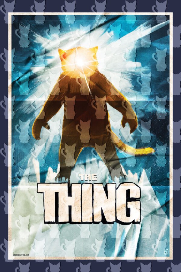 Este design assustador é uma homenagem ao poster de filme “The Thing”, com um gato de silhueta sombria e olhos brilhantes, a emergir do gelo.