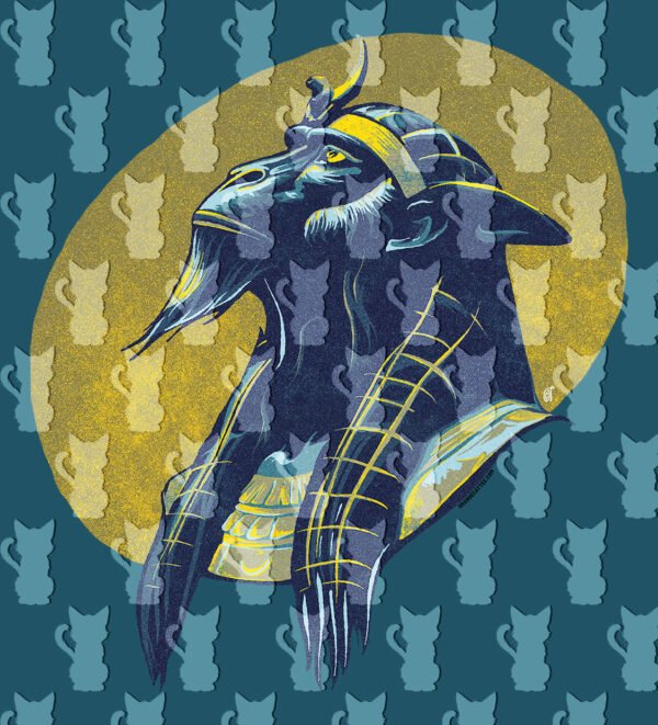 Este design apresenta Thoth, o deus com cabeça de Íbis (ou babuíno), adornado com a joalharia e a barba egípcia tradicional.