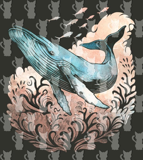 Design Único: A arte utiliza linhas de gravura para dar textura à baleia e às ondas, com o contraste do azul e dos tons quentes do fundo.
