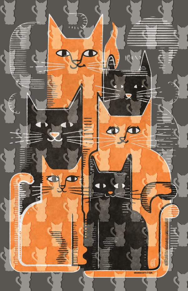 Este design divertido apresenta um grupo de cinco gatos (pretos e laranja) amontoados num estilo de gravura e minimalista.