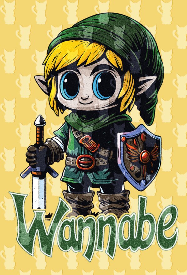 Este design hilariante apresenta um personagem em estilo cartoon (parecido com Link) com a sua espada e escudo, com a frase “Wannabe” por baixo, numa referência cómica ao famoso jogo.
