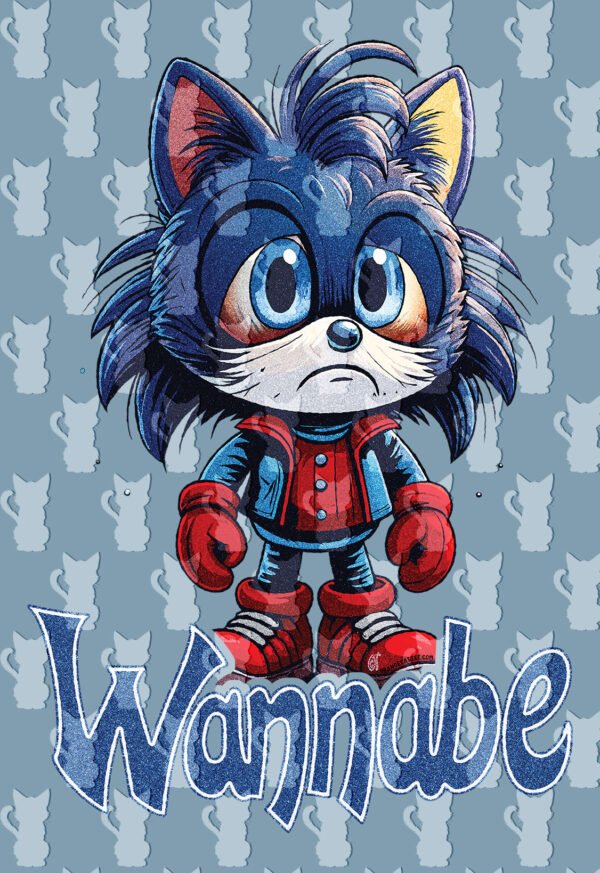 Este design hilariante apresenta um ouriço (parecido com Sonic) em estilo cartoon, com a frase “Wannabe” por baixo, numa referência cómica ao famoso jogo.