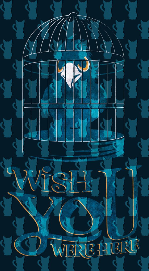 Este design evoca a melancolia com a frase “Wish You Were Here” (Gostava Que Estivesses Aqui) sob a imagem de um pássaro preso numa gaiola.