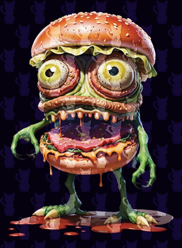 Este design hilariante apresenta um hambúrguer que ganhou vida, com olhos esbugalhados, dentes grandes e membros reptilianos, a pingar molho e sangue.